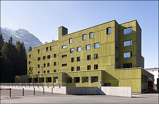 Durch die bauliche Erweiterung und Sanierung der Gebäudehülle wird das Gebäude volumetrisch neu gefasst. Das ehemals stark gegliederte Gebäude erfährt durch diese Umformung eine Beruhigung in der Oberfläche und gewinnt an Prägnanz im Ausdruck. Die gewählte vorgehängte vierfarbige Fassadenhaut in Holz steht im Dialog mit den Farben der Naturlandschaft und verankert das stattliche Gebäude mit dem baulichen und landschaftlichen Kontext. Gleichsam am Ortsrand von St. Moritz in einer Geländekammer zum Statzersee hin gelegen, setzt der neu formulierte Baukörper einen würdigen Akzent und Abschluss des heterogenen Quartiers entlang der Via Surpunt.