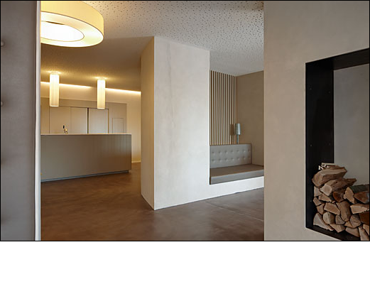 Das Foyer und die Aufenthaltsbereiche im Erdgeschoss werden räumlich neu zusammengefasst. Von der Ortogonalen abweichende Raumkörper gliedern den Gesamtraum in unterschiedliche Raumzonen. Diagonale Sichtbeziehungen zwischen den einzelnen Aufenthaltsbereichen schaffen Transparenz und Übersichtlichkeit. Sitznischen- und bänke laden zum Verweilen ein. Materialien und Oberflächenfarben schaffen zusammen mit der dezenten Beleuchtung ein stimmungsvolles Ambiente.