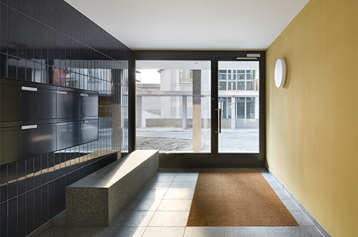 Neben der Gestaltung des Übergangs von Privatheit zu Öffentlichkeit in der Gebäudehülle wird dem gleichen Thema im Zusammenhang mit dem Zugang der Wohneinheiten besondere Aufmerksamkeit geschenkt. Über den gedeckten Eingangsbereich, die Eingangshalle und den Glaslift im grosszügig belichteten Treppenhaus gelangt der Bewohner über eine spezifische Farbigkeit zu seinem privaten Wohnraum. Die beiden Häuser sind identisch organisiert, sie unterscheiden sich nur in ihrer Farbgebung, in der inneren, wie in der äusseren Erscheinung.