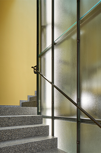 Neben der Gestaltung des Übergangs von Privatheit zu Öffentlichkeit in der Gebäudehülle wird dem gleichen Thema im Zusammenhang mit dem Zugang der Wohneinheiten besondere Aufmerksamkeit geschenkt. Über den gedeckten Eingangsbereich, die Eingangshalle und den Glaslift im grosszügig belichteten Treppenhaus gelangt der Bewohner über eine spezifische Farbigkeit zu seinem privaten Wohnraum. Die beiden Häuser sind identisch organisiert, sie unterscheiden sich nur in ihrer Farbgebung, in der inneren, wie in der äusseren Erscheinung.