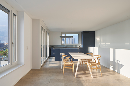Eine Besonderheit bilden die jeweils vier Attikawohnungen, welche sich über 2 Geschosse verteilen. Mit dieser Organisation wird das privilegierte Attikageschoss ausschliesslich durch Wohnräume besetzt und für mehr Wohnungen erlebbar gemacht.