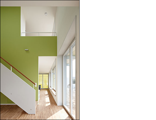 Die vorgelagerte Böschenstrasse ermöglicht eine unverbaute Weitsicht zum Bündner Oberland im Westen, gleichzeitig aber wird das Grundstück durch mögliche Einsicht von der Strasse her beeinträchtigt. Die Qualitäten dieser Lage werden durch eine die Gestalt des Gebäudes prägende Raumschicht architektonisch thematisiert. Der vorgelagerte Filter – die mit Glyzinien bewachsene, vorgehängte Loggia des Obergeschosses – bietet Schutz gegen unerwünschte Einblicke und lässt den Blick in die Landschaft frei. Die offenen Wohn- und Arbeitsräume im Innern sind über zwei Geschosse um die senkrecht zum Hang verlaufende Treppe gruppiert und bieten räumlich reichhaltige Sichtbezüge.