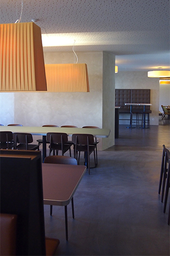 Der Speisesaal wird gegen das Foyer räumlich geöffnet, sodass die freie Zirkulation für die Gäste verbessert wird. Eine lange Bank an der Rückwand unterstützt die Ausrichtung des Speisesaals. Zusätzlich wird der Raum durch eine mittlere, fest eingebaute Gruppe aus 6-er Tischen räumlich gegliedert und bietet intime Aufenthaltsbereiche für Familien und Kleingruppen an. Die Möblierung aus dunkel gebeizten Holzwerksplatten und Sitzpolster in braunem Leder binden die Möbel an den dunklen Holz-Zementbelag. Die Tische mit farblich abgestimmten Tischplatten aus Linoleum bilden Farbakzente und unterstützen die räumliche Struktur des Speisesaals. Das Farbkonzept und die Farbberatung entstand in Zusammenarbeit mit Andrea Burkhard, Architektur und Farbe, Zürich.