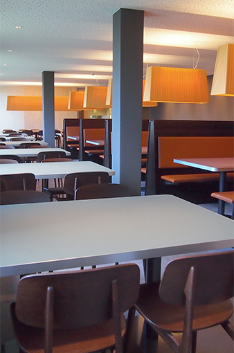 Der Speisesaal wird gegen das Foyer räumlich geöffnet, sodass die freie Zirkulation für die Gäste verbessert wird. Eine lange Bank an der Rückwand unterstützt die Ausrichtung des Speisesaals. Zusätzlich wird der Raum durch eine mittlere, fest eingebaute Gruppe aus 6-er Tischen räumlich gegliedert und bietet intime Aufenthaltsbereiche für Familien und Kleingruppen an. Die Möblierung aus dunkel gebeizten Holzwerksplatten und Sitzpolster in braunem Leder binden die Möbel an den dunklen Holz-Zementbelag. Die Tische mit farblich abgestimmten Tischplatten aus Linoleum bilden Farbakzente und unterstützen die räumliche Struktur des Speisesaals. Das Farbkonzept und die Farbberatung entstand in Zusammenarbeit mit Andrea Burkhard, Architektur und Farbe, Zürich.
