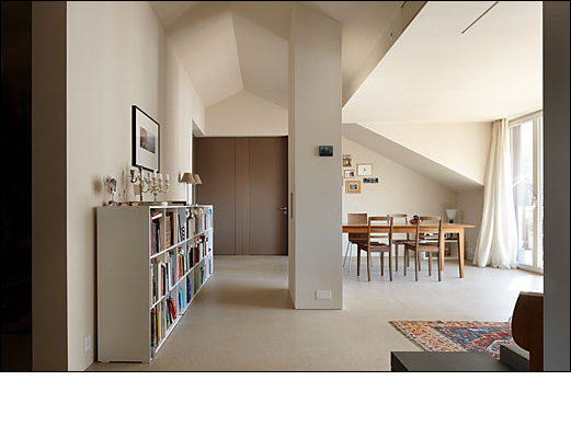 Die drei symmetrischen Hauptfassaden und die filigrane, eiserne Veranda prägen die schlichte äussere Erscheinung des Gebäudes. Der vorhandene Dachstuhl mit Druckstäben musste den aktuellen Ausbauwünschen im Dachgeschoss geopfert werden, gleichzeitig konnte mit der Erneuerung der Zimmermannsarbeiten die Dachfläche um 60 cm gehoben werden ohne den Charakter des Hauses wesentlich zu verändern. Im Äusseren wurde der Verputz ab dem Bruchsteinmauerwerk neu aufgebaut und mit einer Mineralfarbe gestrichen, welche sich mit dem hellen grünen Farbton am Bestand orientiert. Durch die Konzeption der Wohnung mit zentralem Wohnbereich und der räumlichen Integration der Lukarnen konnten die flachen und eher räumlich drückenden Dachflächen überspielt werden. Die Dachwohnung setzt sich durch die Materialwahl und Farbgebung von den bestehenden Wohnungen ab.