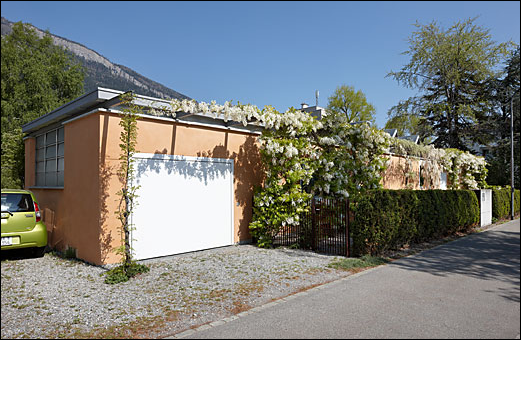 Das Gebäude als Abfolge von Wohnräumen, Innenhof und Garage erstreckt sich entlang der Quartierstrasse als eingeschossiges Volumen. Als Reaktion auf die engen Beziehungen zur Strasse ist der Wohnbereich introvertiert ausgerichtet und die Fassade ist raumhaltig gestaltet. Ein Vorhang aus Glyzinien bildet einen Filter zu Strassenraum und Nachbarschaft und schützt den als Wohnraumerweiterung konzipierten Innenhof vor Einblicken. Die Aussenwände sind mit einem Einsteinmauerwerk ausgebildet und innen wie aussen mit Sumpfkalk verputzt. Das Dach ist aus Holz konstruiert, die Hängevorrichtung der grünen Ummantelung ist aus Stahl. Die Baukonstruktion und Gebäudetechnik erfüllen den Minergie-Standard.