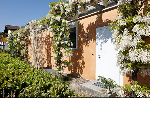Das Gebäude als Abfolge von Wohnräumen, Innenhof und Garage erstreckt sich entlang der Quartierstrasse als eingeschossiges Volumen. Als Reaktion auf die engen Beziehungen zur Strasse ist der Wohnbereich introvertiert ausgerichtet und die Fassade ist raumhaltig gestaltet. Ein Vorhang aus Glyzinien bildet einen Filter zu Strassenraum und Nachbarschaft und schützt den als Wohnraumerweiterung konzipierten Innenhof vor Einblicken. Die Aussenwände sind mit einem Einsteinmauerwerk ausgebildet und innen wie aussen mit Sumpfkalk verputzt. Das Dach ist aus Holz konstruiert, die Hängevorrichtung der grünen Ummantelung ist aus Stahl. Die Baukonstruktion und Gebäudetechnik erfüllen den Minergie-Standard.